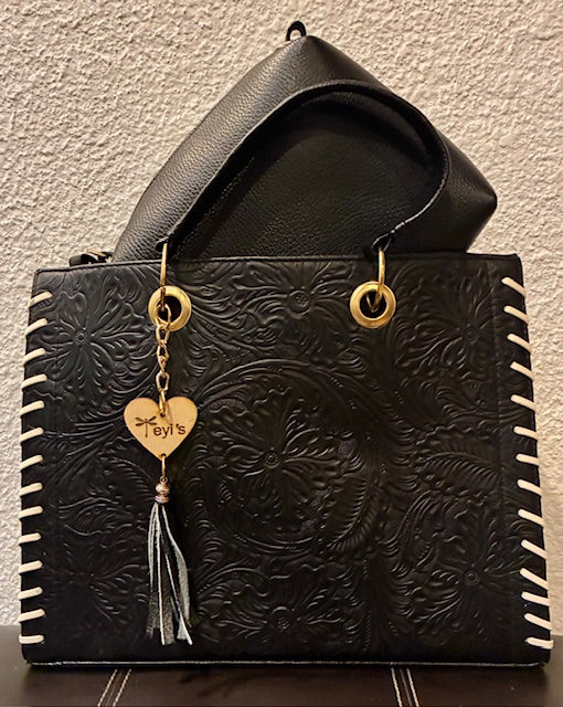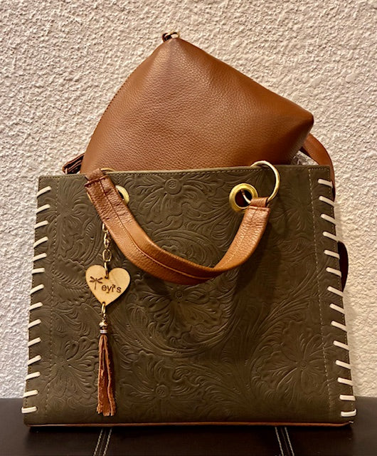 Bolsa de tamaño amplio, detalles cocidos a mano. Disponible en elegante negro o en una combinación de verde con café, incluye una bolsa interior tipo cosmetiquera completamente de piel. Grabado floral. Cuenta con asas y correa larga, puede llevarse tanto en la mano como cruzada, ofreciendo funcionalidad.