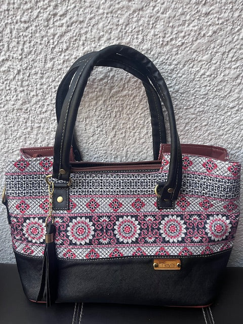 Bolsa grande hecha de yute estampado color negro, rojo y blanco. amplia con asas y correa ajustable, estilo casual para el día a día.