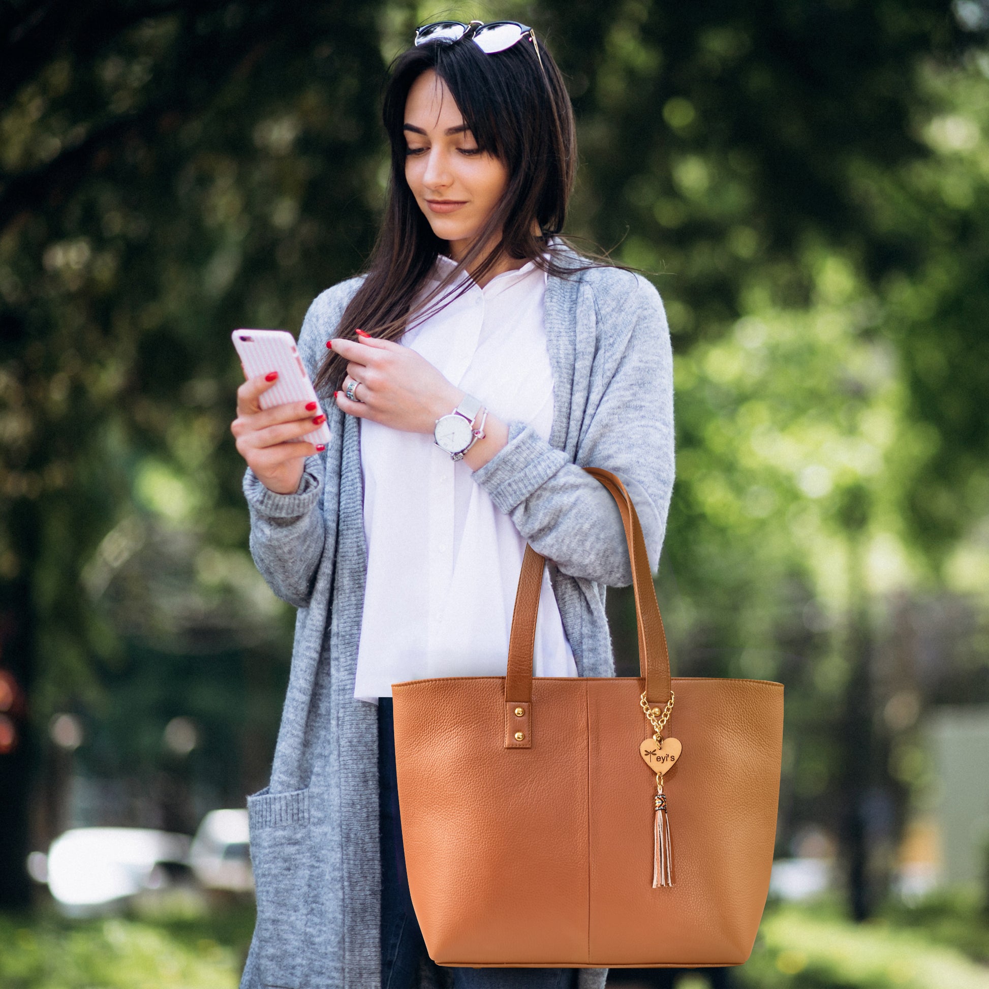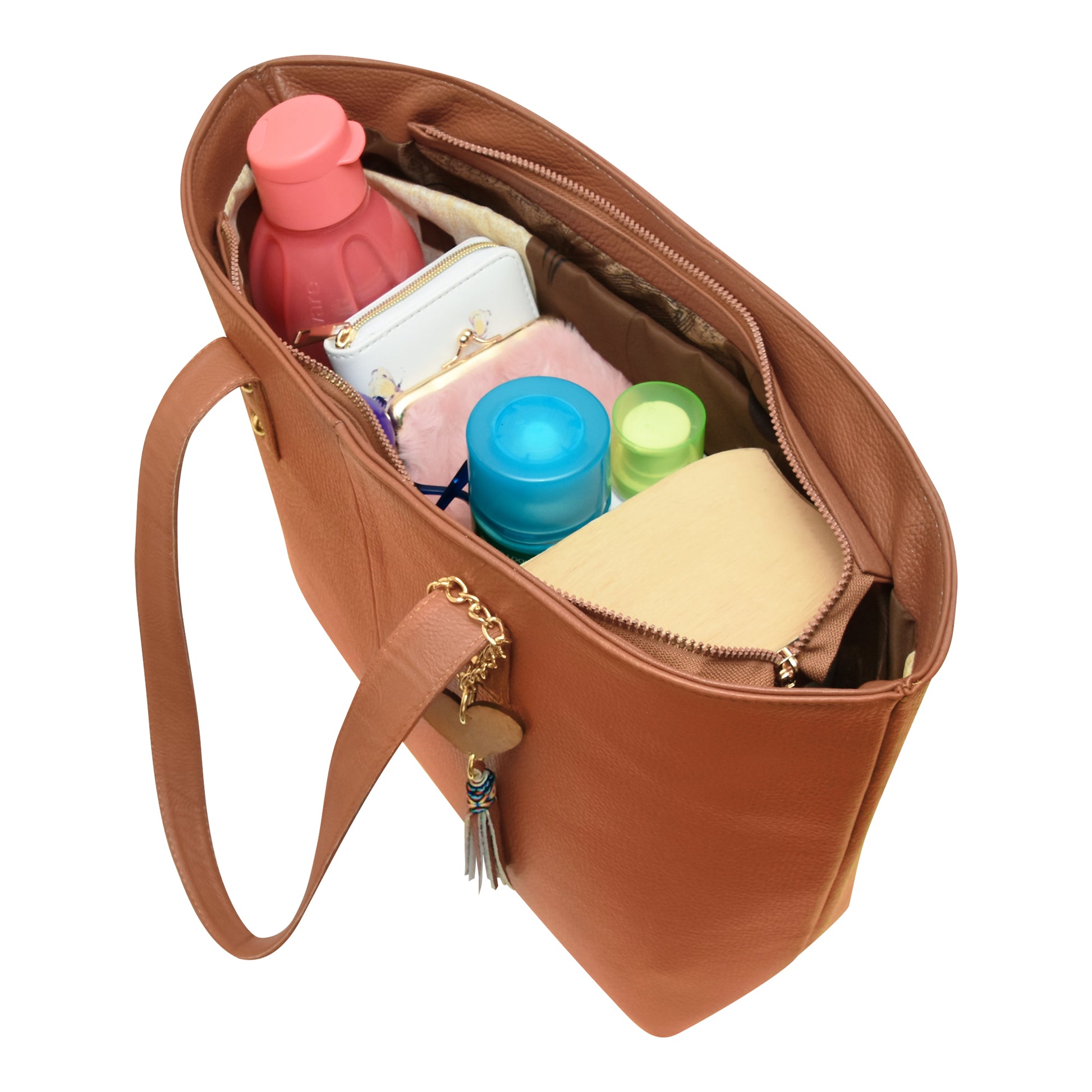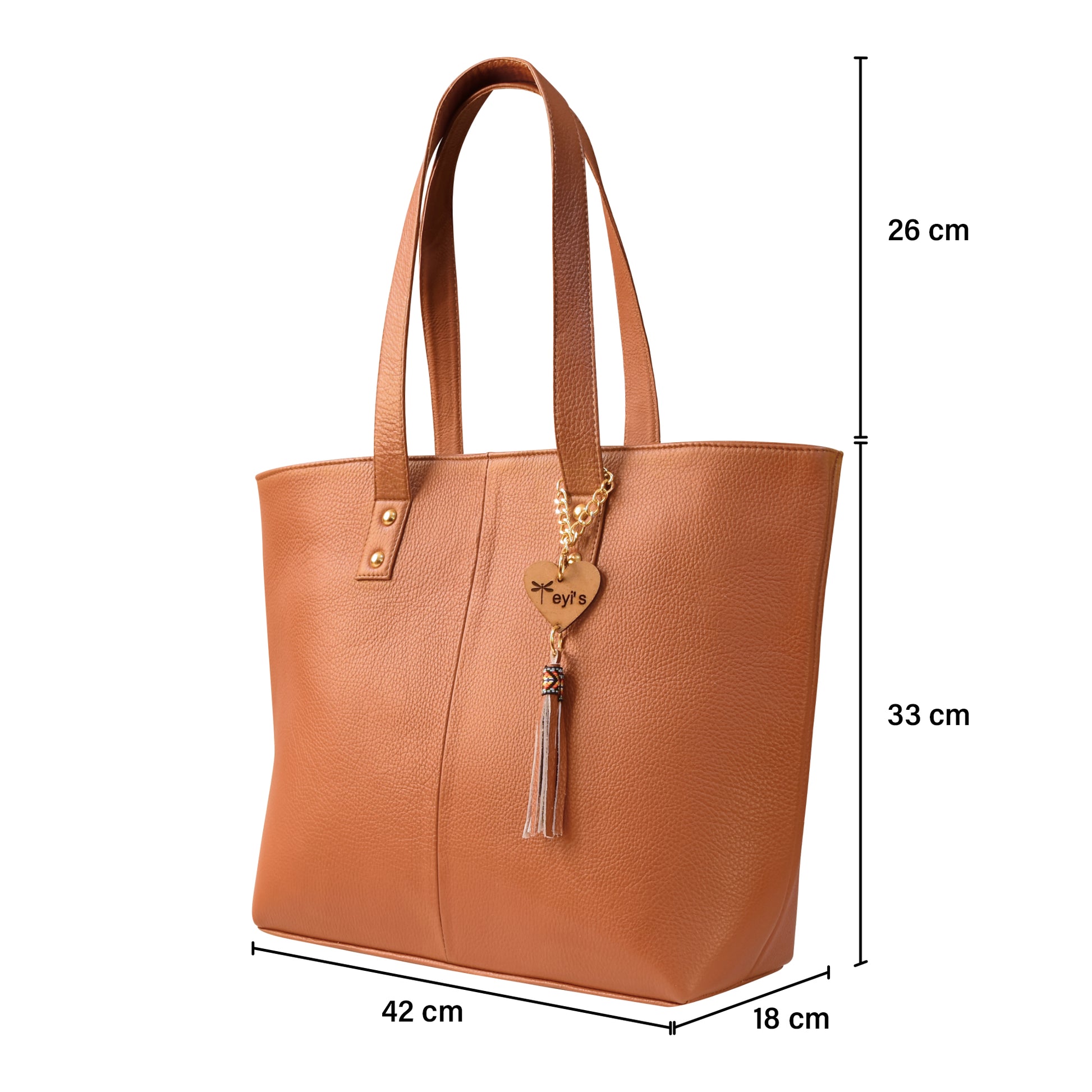 Bolsa tote grande, amplia de piel genuina con acabado liso color miel o cafe claro camel. Diseño formal y elegante.