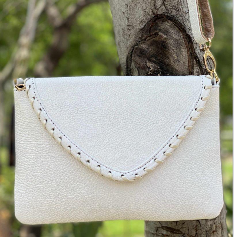 Bolsa tipo sobre hecha de piel genuina en color blanco, ideal para llevar lo indispensable con estilo, tamaño chica a mediana, con correa corta para usar cómodamente en la muñeca y también correa larga ajustable. Perfecta para salidas rápidas, eventos o momentos especiales.