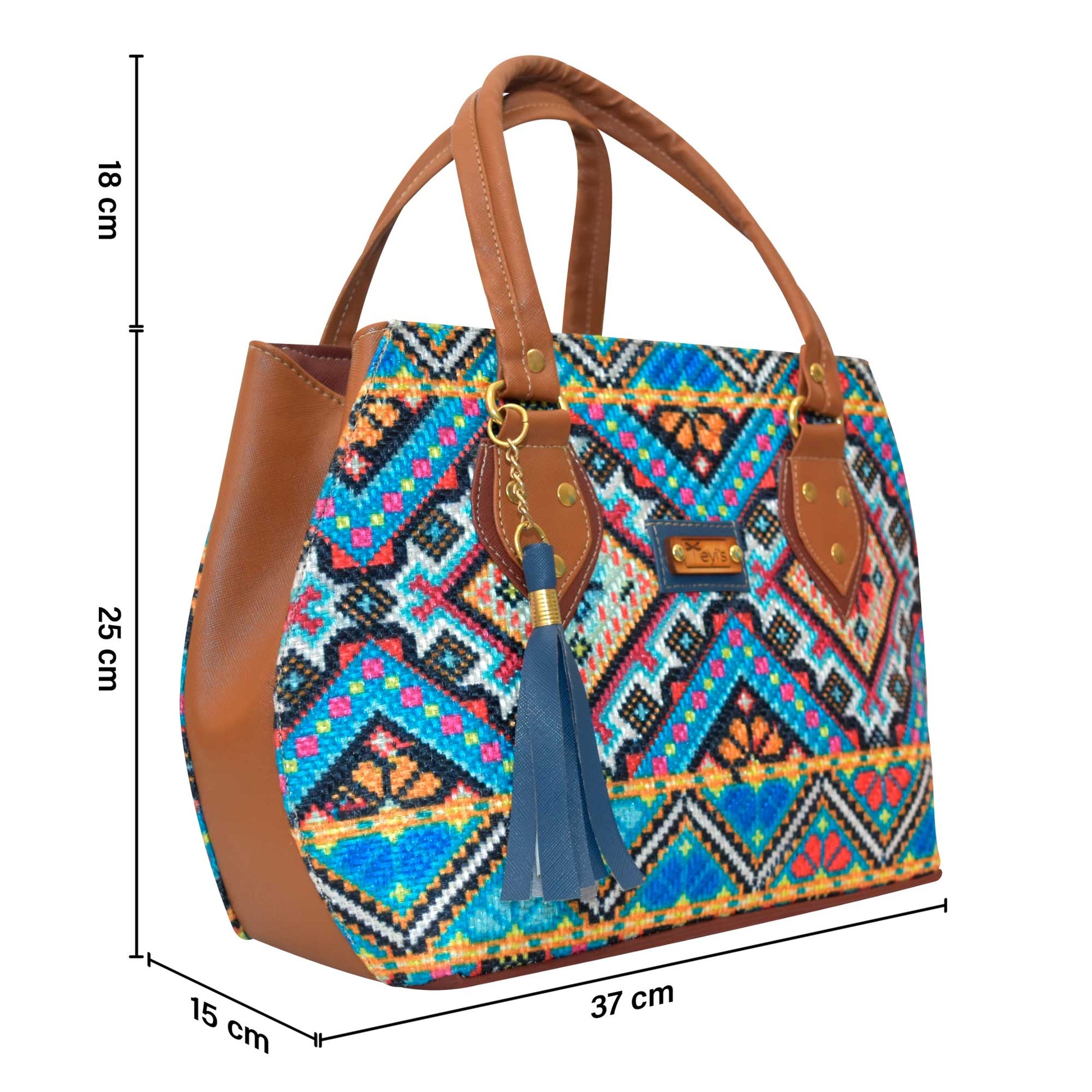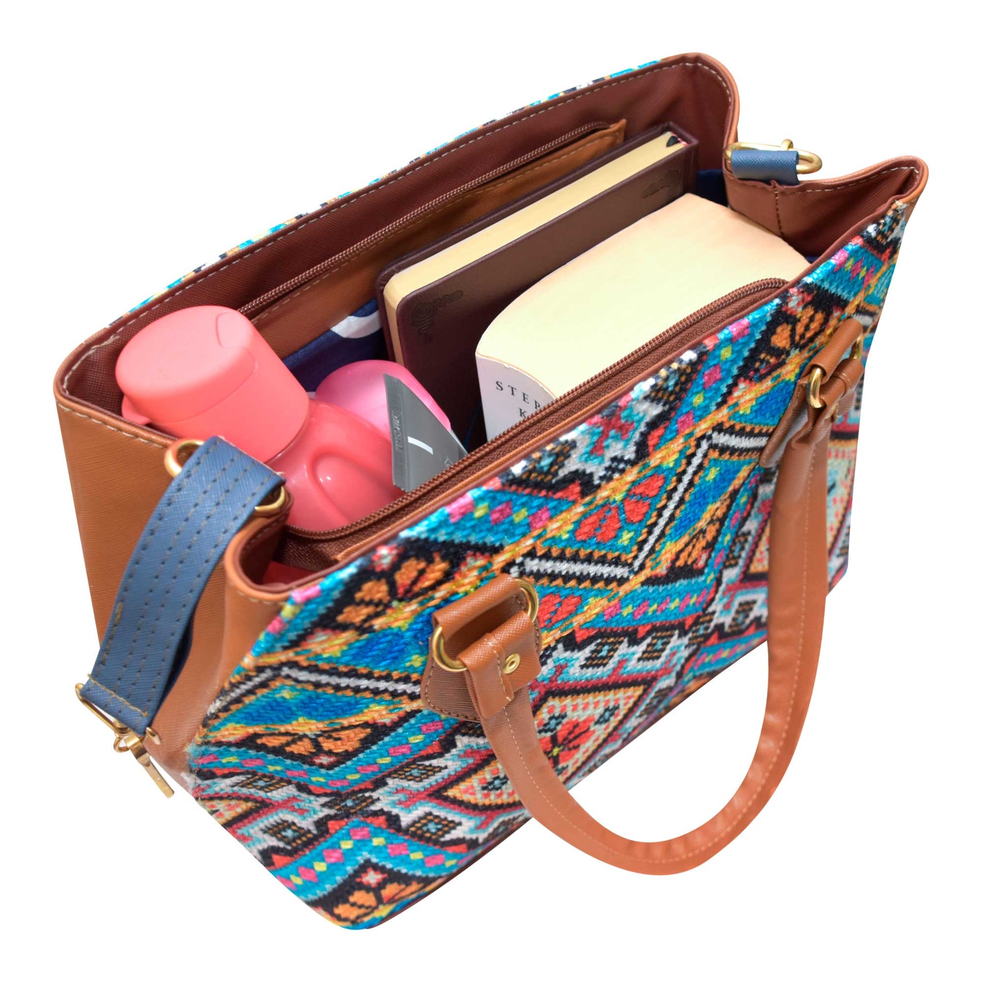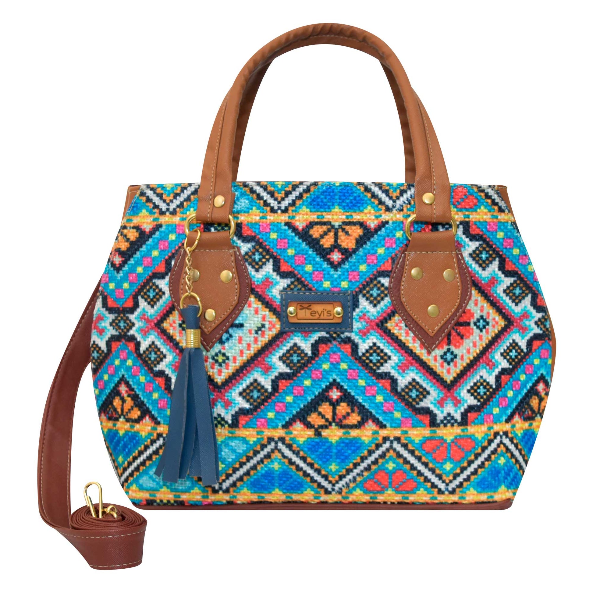 Bolsa de Yute mexicano estampado de color azul claro, tamaño mediana-grande, con asas y correa ajustable, diseño artesanal mexicano, casual perfecto para el día a día.
